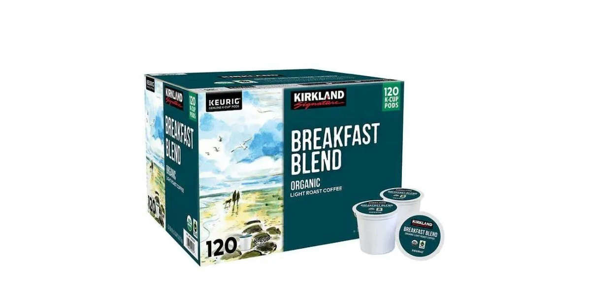 Kirkland Signature Breakfast Blend Organic K-Cup Pods, in a 120-count box, deliver balanced morning coffee cheaper per pod than Green Mountain or Starbucks, with low acidity for sensitive stomachs.