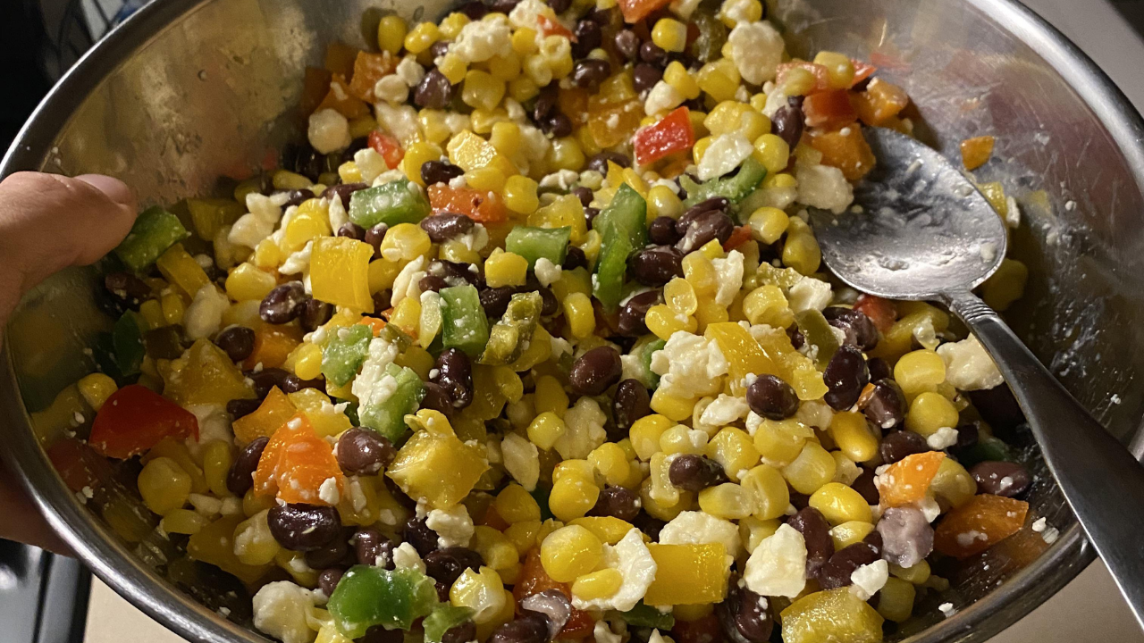 Corn, chopped peppers, black beans, and a limey dressing. This dish is usually a side, but it holds up just fine.